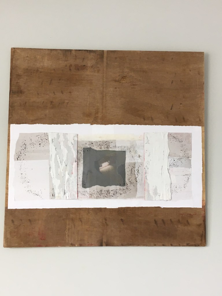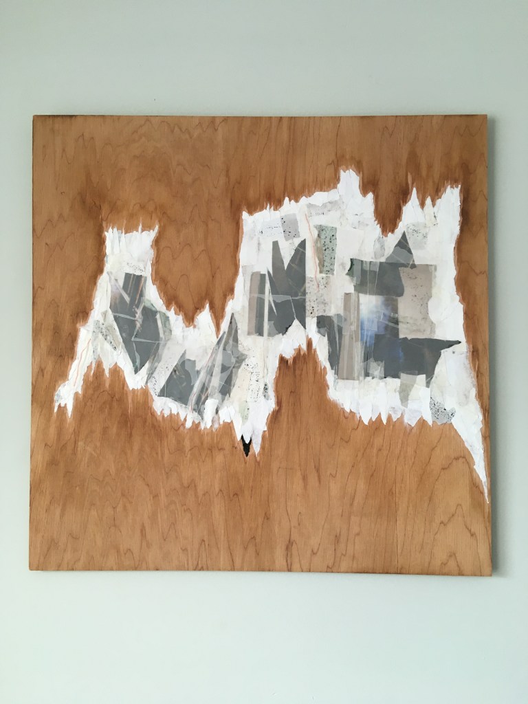 Breath (healing). Conveying the artist’s efforts to reorganize her life and heal after prolonged mold exposure. Images of mold and actual mold spores (sealed in clear gel for safety) pervade the piece. At the center, an image of mold spores, mirroring the images of mold encircling the wood collages. On either side of that, actual mold spores. The white, clinical effect achieved with medical tape and the backs of torn-up water-damaged posters. The red line representing lifeline, blood, living, breathing.
