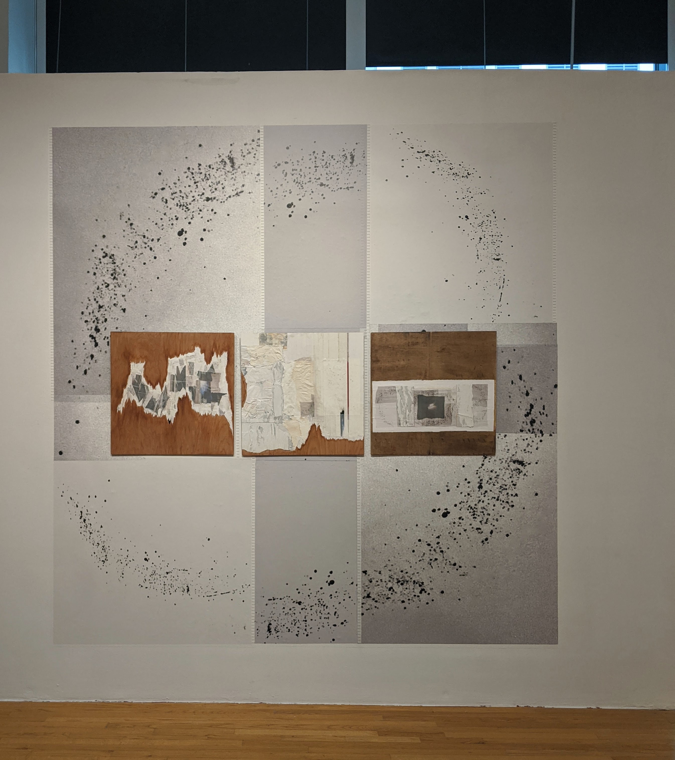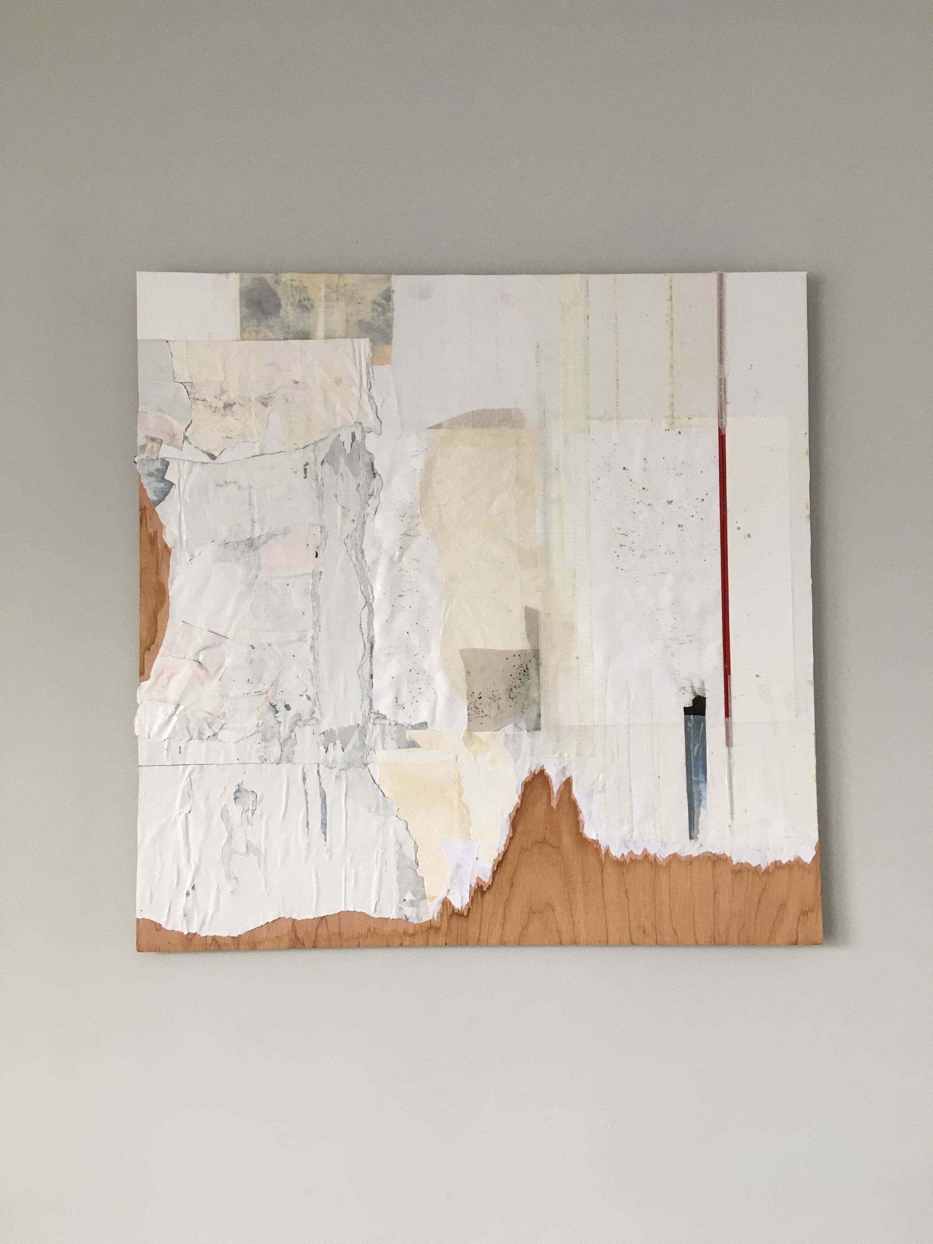 Breath (healing). Conveying the artist’s efforts to reorganize her life and heal after prolonged mold exposure. Images of mold and actual mold spores (sealed in clear gel for safety) pervade the piece. At the center, an image of mold spores, mirroring the images of mold encircling the wood collages. On either side of that, actual mold spores. The white, clinical effect achieved with medical tape and the backs of torn-up water-damaged posters. The red line representing lifeline, blood, living, breathing.