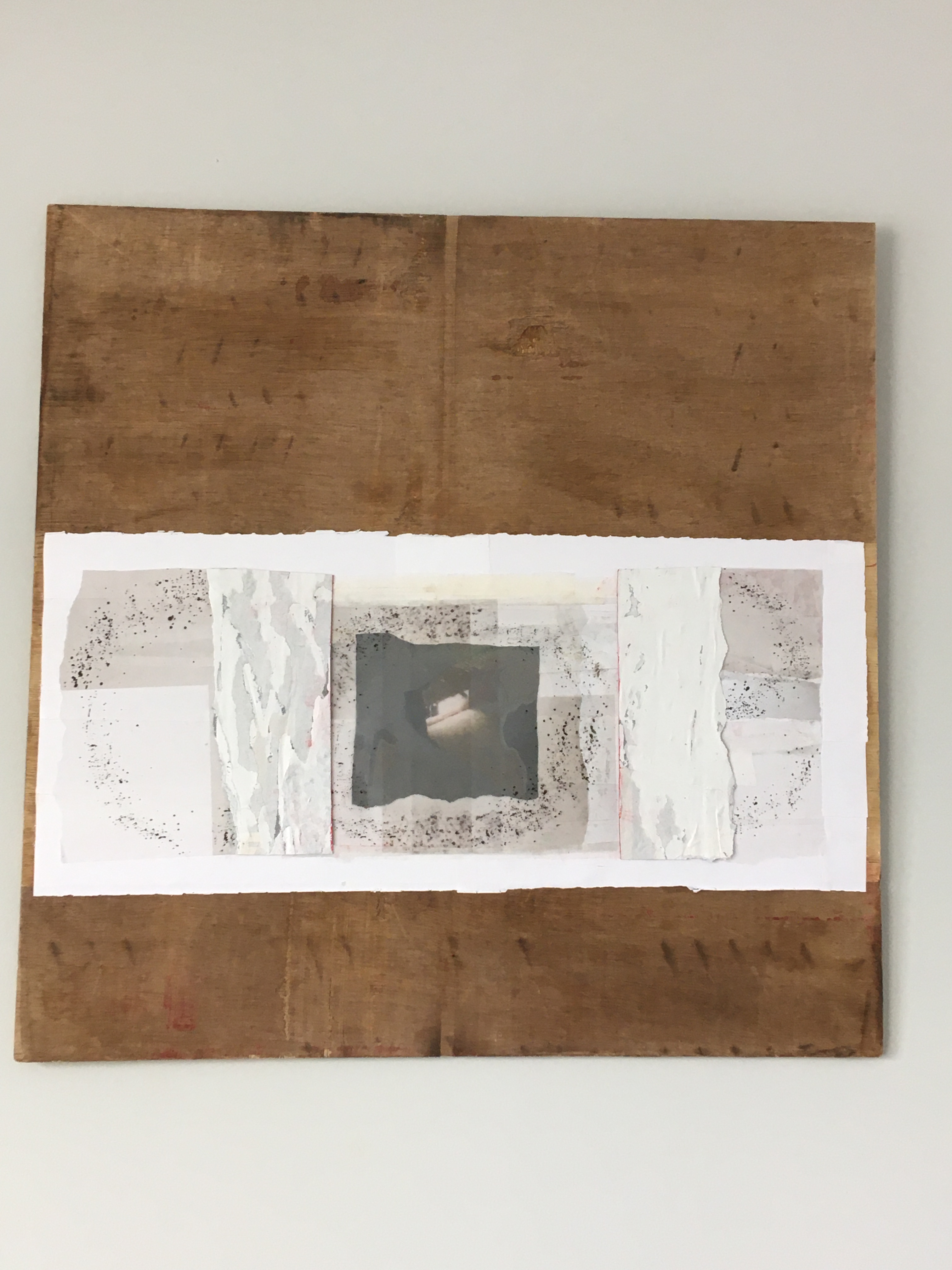 Breathing (silent invasion). Photographs of the flooded basement, cut up and reassembled into an abstract form that follows the shape of the water stain on the found piece of wood. Conveys the idea of the stain of black mold growing, distorting invisibly in the walls of your home. Looks normal on the outside but inside, this stain that’s affecting or will affect your life in so many ways.